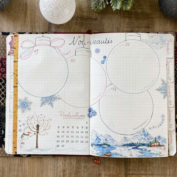 2 double-pages de bullet journal hebdomadaire hivernal créé avec les masking tapes Scènes de l'hiver, Village de noël et Chats joeurs. Support : Carnet artisanal couverture en tissu amovible | Vintage patchwork