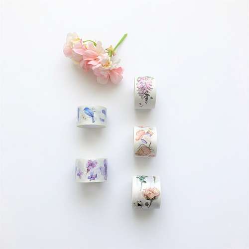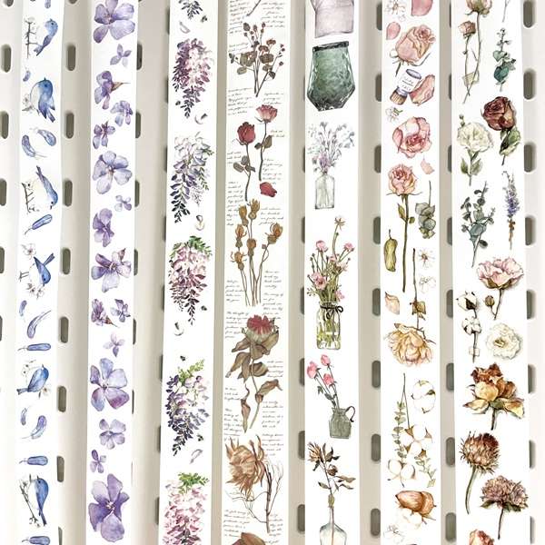 Imprimés sur un washi de haute qualité, ces rubans offrent une adhérence douce, se repositionnent facilement et peuvent être utilisés sur papier, verre, métal et autres surfaces lisses. Chaque rouleau révèle une ambiance particulière : vases fleuris, violettes légères, glycine en cascade, compositions rétro-botaniques… Un ensemble parfait pour enrichir vos créations de notes élégantes et poétiques.