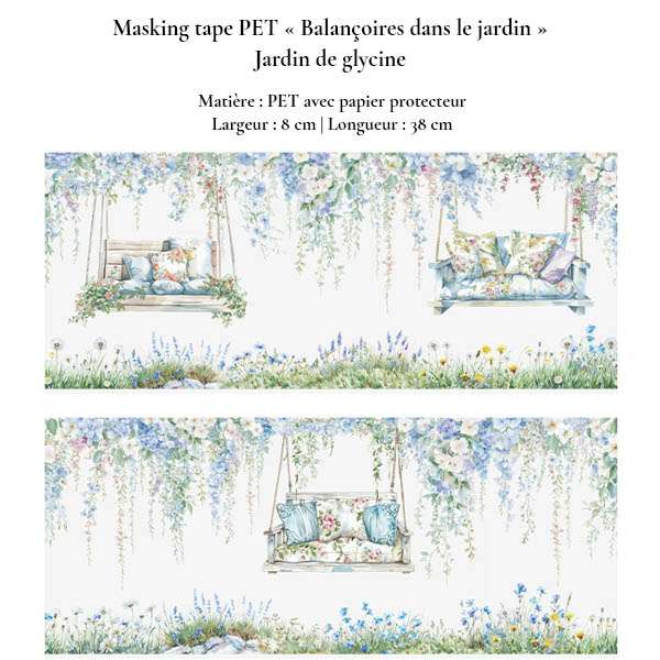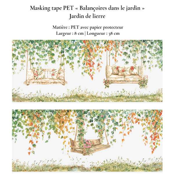 Apportez une touche de poésie printanière à vos carnets avec notre collection de masking tapes en PET « Balançoires dans le jardin » illustrant des balançoires suspendues dans des jardins fleuris. Trois univers végétaux – glycine, vigne et lierre – pour créer des compositions douces, naturelles et poétiques dans vos projets créatifs. Cette collection s’adresse aussi bien aux amateurs de bullet journal, de scrapbooking, de carterie créative qu’aux passionnés de journaling artistique.