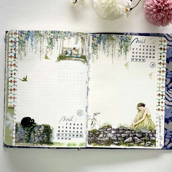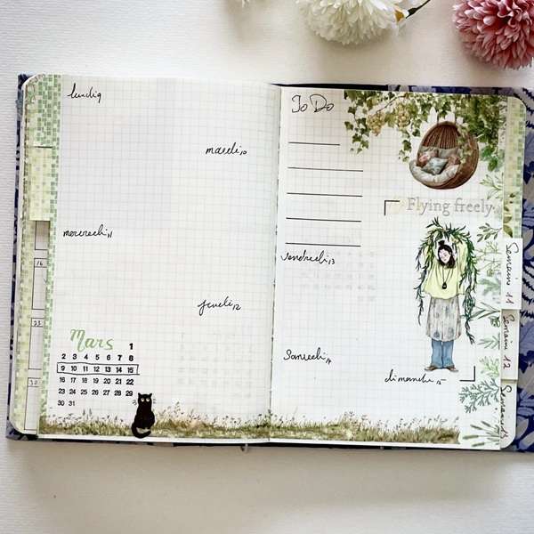 mise en page de bullet journal hebdomadaire printemps Double-page de planning mensuel de bullet journal sur le thème printemps décorée avec les masking tapes Promenade fleurie, Balançoires dans le jardin, Chat noir et Couleurs du monde. Support : Carnet artisanal couverture en tissu amovible | Pensées légères