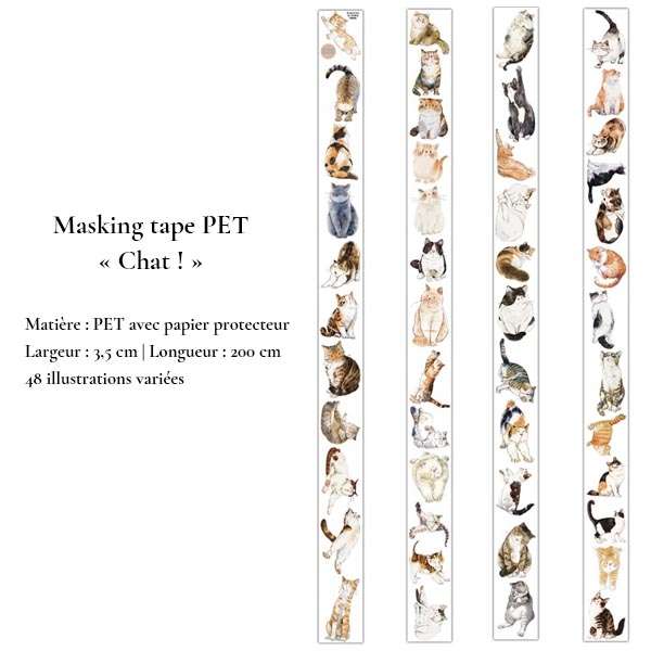 Avec sa largeur de 3,5 cm, ce ruban décoratif est parfait pour structurer une page de bullet journal, encadrer une photo, décorer une carte faite main ou enrichir un carnet créatif. Le PET garantit une excellente résistance, une pose précise et un décollage net, sans déchirer le papier. Chaque dessin est le fruit du travail d’une illustratrice chinoise indépendante - Ding Ding, qui donne vie à ces silhouettes gracieuses par un style délicat et expressif. Ce masking tape séduira aussi bien les amoureux des chats que les passionnés de papeterie créative, à la recherche de matériaux originaux et qualitatifs.