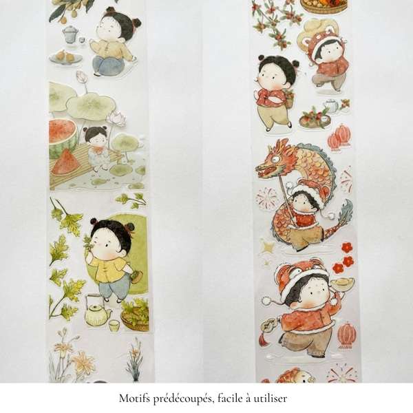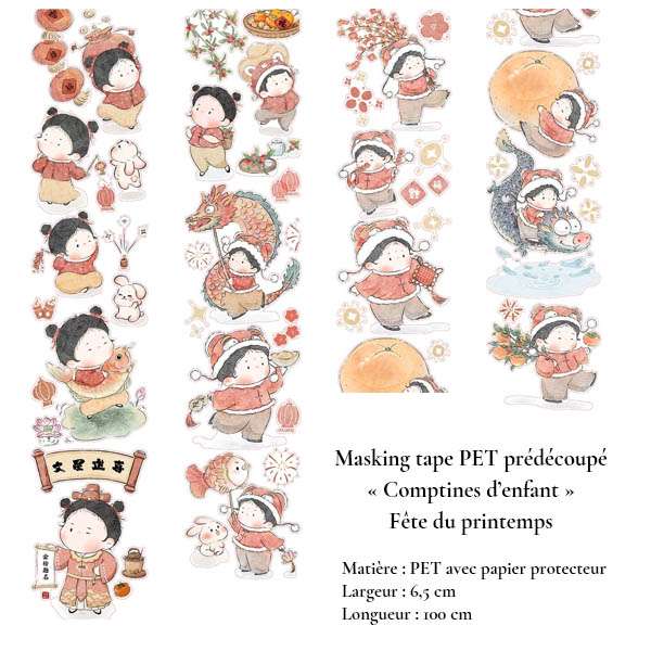 La collection "Comptines d’enfant" invite à redécouvrir la poésie des saisons, des fêtes et des petits instants du quotidien à travers une série de masking tapes PET prédécoupés délicatement illustrés. Chaque rouleau déroule une histoire visuelle : un enfant qui cueille les feuilles d’automne, partage un thé d’hiver, contemple les lotus d’été ou célèbre la Fête du printemps sous les lanternes rouges. Les scènes, inspirées d’un imaginaire doux et intemporel, mêlent nature, traditions et simplicité. Idéale pour les amateurs de papeterie créative, de bullet journal et de scrapbooking artistique.