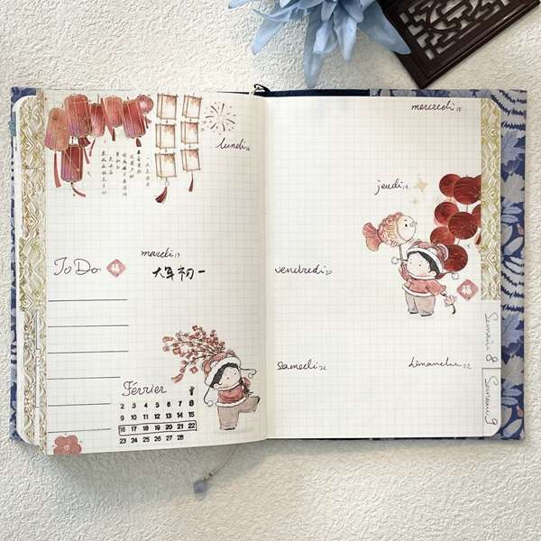 Double-page de planning mensuel de bullet journal sur le thème du nouvel an chinois décorée avec les masking tapes Le rituel du printemps, Fête de lanternes, Le chant des lotus, Comptines d'enfnat et Rêves de nos ancêtres. Support : Carnet artisanal couverture en tissu amovible | Pensées légères