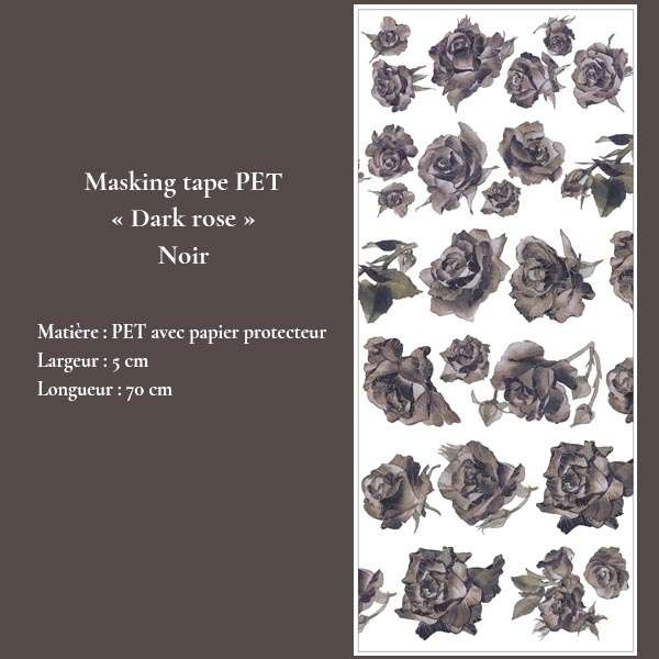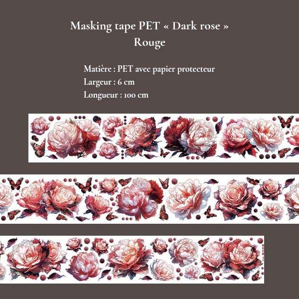 Plongez dans l’univers intense et poétique de la collection “Obscur et mystérieux”, avec cette série de 4 masking tapes en PET “Dark Rose”. Chaque ruban met en scène des roses profondes et détaillées, parfois accompagnées de papillons et de motifs délicats, dans une palette sombre et sophistiquée. Le rendu translucide du PET avec papier protecteur apporte une finition élégante, idéale pour les superpositions et compositions artistiques.