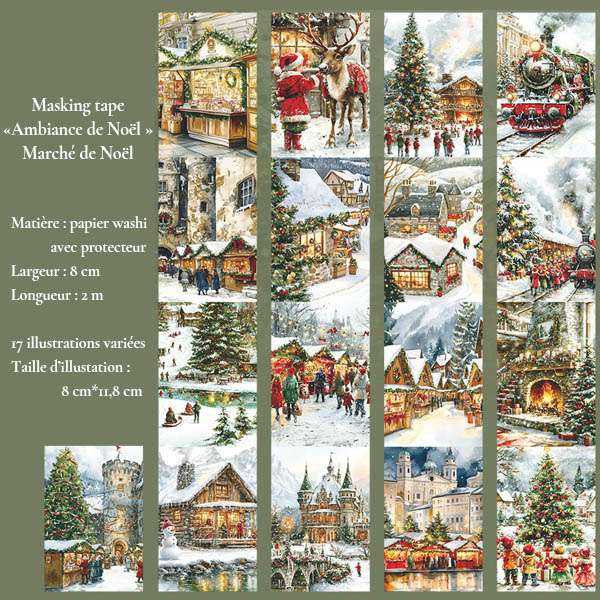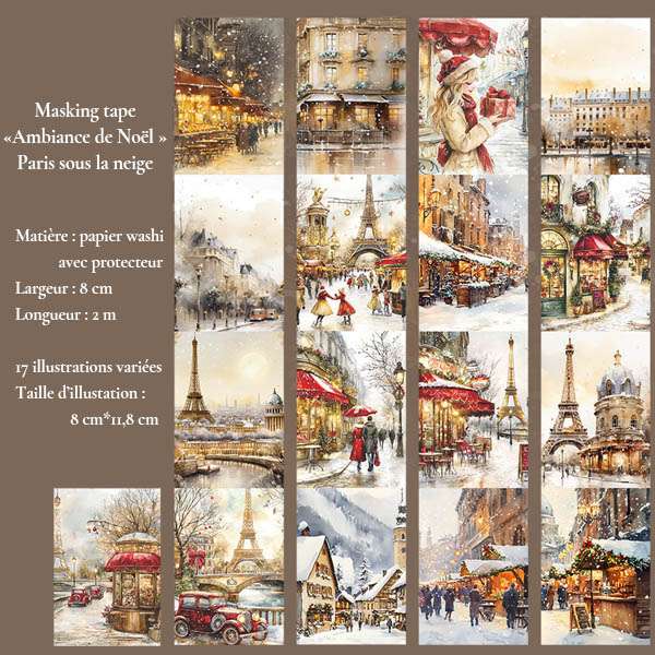 Plongez dans la magie de Noël avec ces masking tapes washi grand format, illustrés de scènes hivernales chaleureuses : marchés de Noël féeriques et Paris sous la neige. Parfaits pour bullet journal, scrapbooking, cartes et décorations de fin d’année.