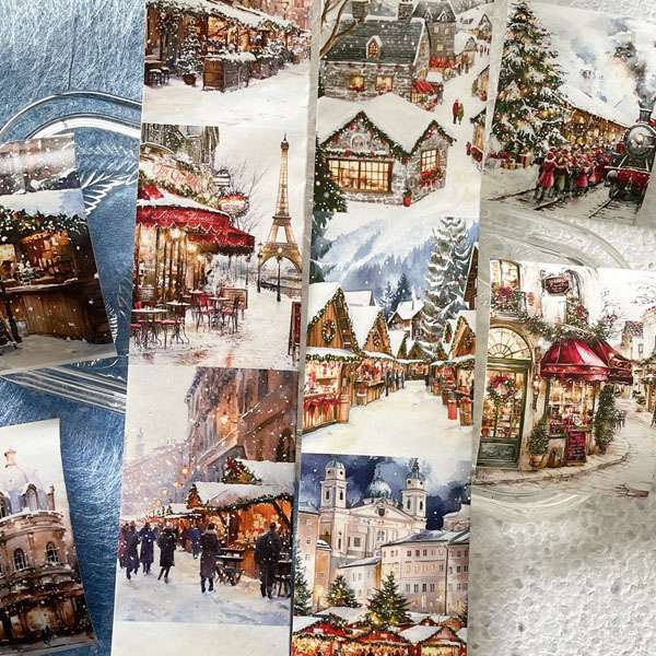 Ces masking tapes washi Ambiance de Noël apportent une atmosphère chaleureuse et poétique à toutes vos créations de papeterie. Chaque rouleau est composé de 17 illustrations variées, finement détaillées, représentant des scènes de marchés de Noël, des villages enneigés, des sapins illuminés et des rues parisiennes sous la neige.