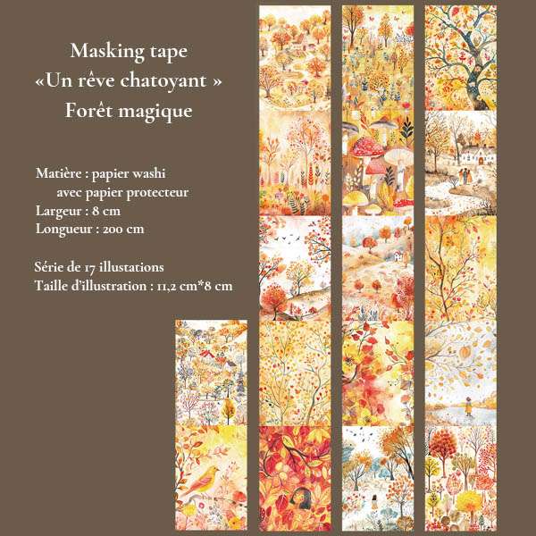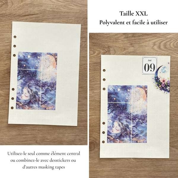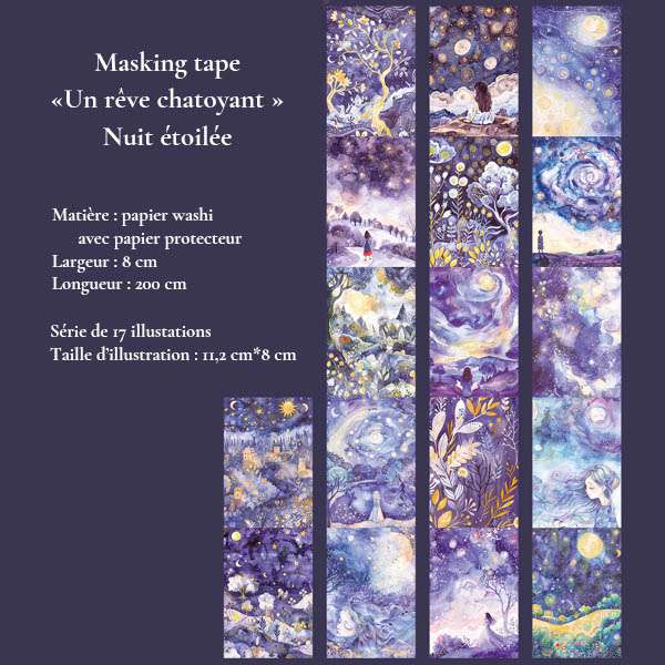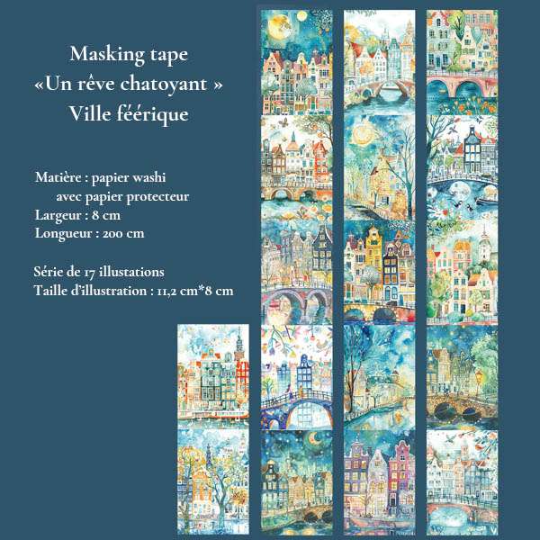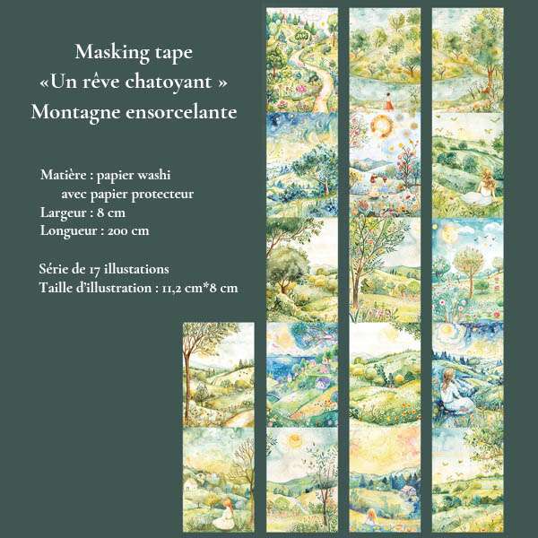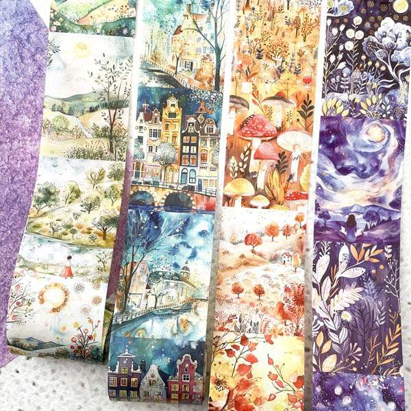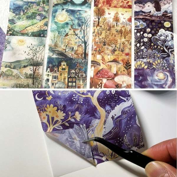 Plongez dans un univers de poésie visuelle avec nos grands masking tapes en papier washi, illustrés de paysages oniriques, de villages colorés, de forêts enchantées et de ciels étoilés. Idéal pour le journaling, le scrapbooking, et les loisirs créatifs.