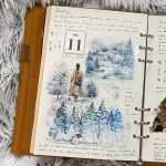 Une page de daily journal sur le thème d'hiver réalisé avec les stickers Ambiance hivernale et les maksing tapes Quatre saisons en forêt et Esprit d'hiver