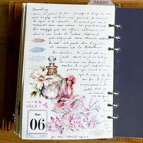 Cette page de daily journal est composée avec le masking tape Fleurs scintillantes et les stickers Bouteillas de parfum rococo et Roseraie.