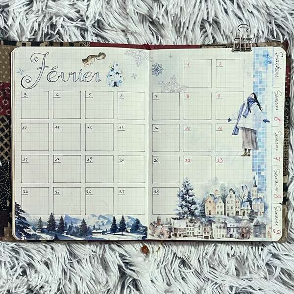 Le bullet journal monthly setup de février réalisé avec les stickers Ambiance hivernale et La forêt sous la neige et les maksing tapes Villages féériques, Flocons de neige, Quatre saisons en forêt et Décor neige.