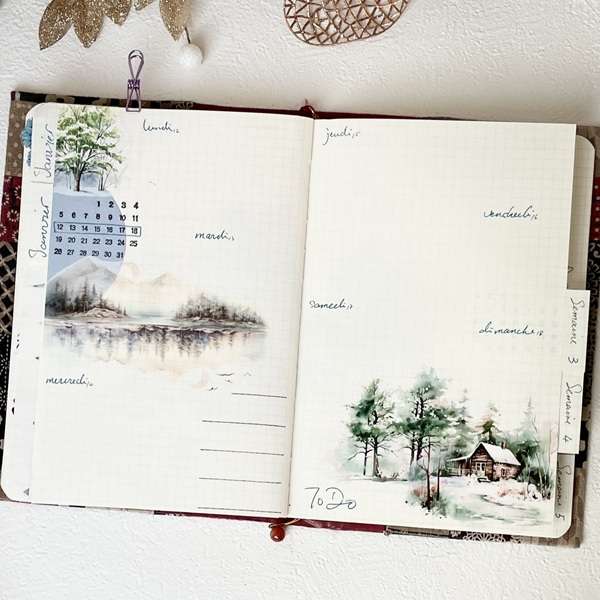 Mise en page de bullet journal hebdomadaire ambiance hivernale avec les stickers Charme de l'hiver et La forêt sous la neige, et le masking tape Les quatres saisons de la montagne. Support : Support : Carnet artisanal couverture en tissu amovible | Vintage patchwork