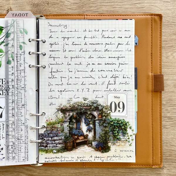 Une page de daily journal champêtre réalisée avec le masking tape Mur des fleurs et le sticker Vintage gardens